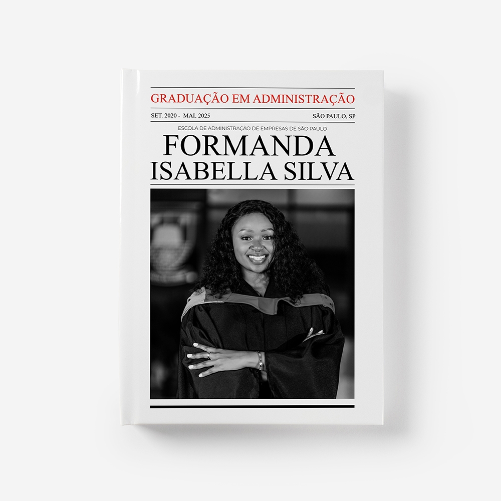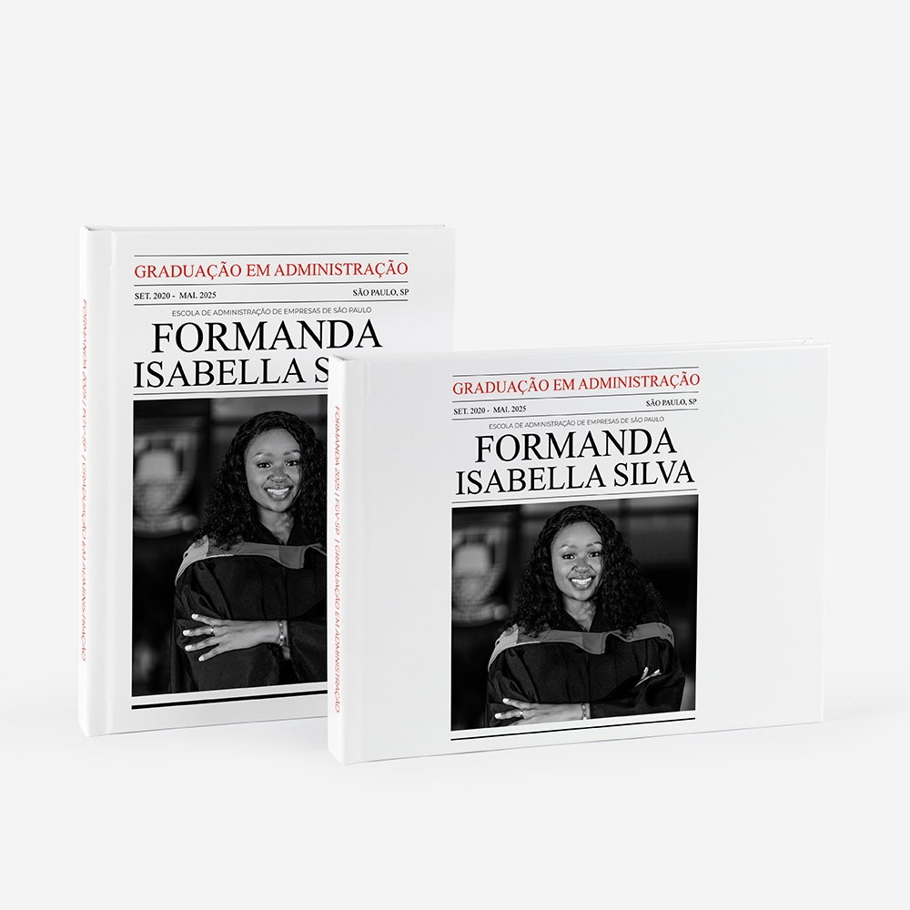 Este álbum tem o visual de uma capa de jornal, pensado para quem quer marcar a diferença. Aqui cabem as fotos da colação de grau, os momentos com os colegas, os aplausos no fim do discurso e aquele orgulho de missão cumprida.