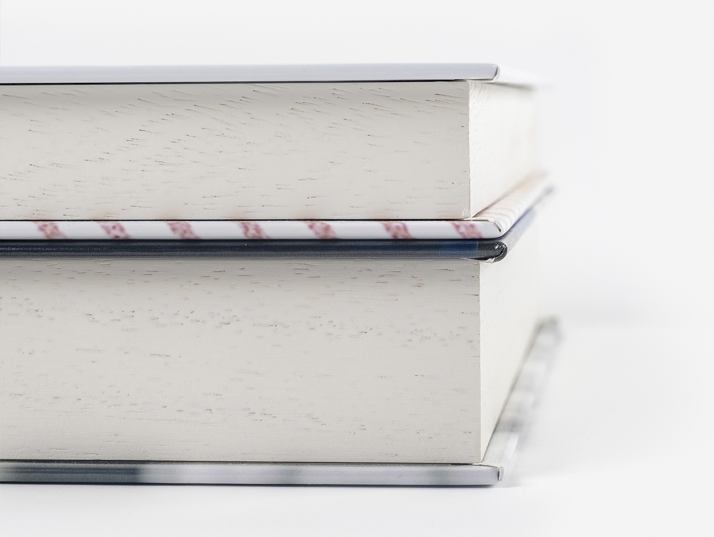 As Boxes vêm com uma fita em cetim, disponível em preto ou branco (dependendo da cor do aro de madeira escolhido). A fita é colocada cuidadosamente sob o álbum, facilitando a retirada e garantindo um manuseio seguro.