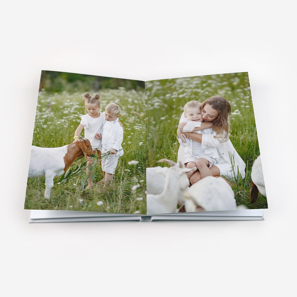 Os Álbuns de Fotos Dreambooks apresentam uma abertura panorâmica, com a possibilidade de colocar uma foto em destaque ocupando duas páginas. Dessa forma, desfrutará de uma visualização perfeita das suas fotos, sem cortes ou partes escondidas.